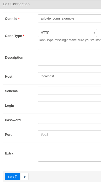 Airflow will use the Airbyte API to execute our actions. The Airbyte API uses HTTP, so we'll need to create a HTTP Connection. Airbyte is typically hosted at localhost:8001. Configure Airflow's HTTP connection accordingly - we've provided a screenshot example.